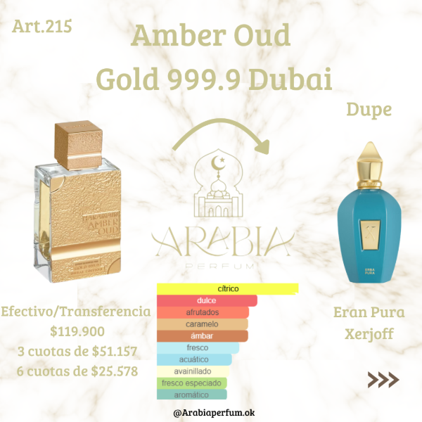 Amber Oud Gold 999.9 Dubai Edition de Al Haramain Perfumes es una fragancia de la familia olfativa Floral Frutal Gourmand para Hombres y Mujeres.