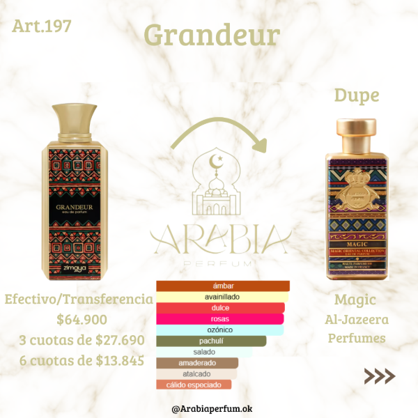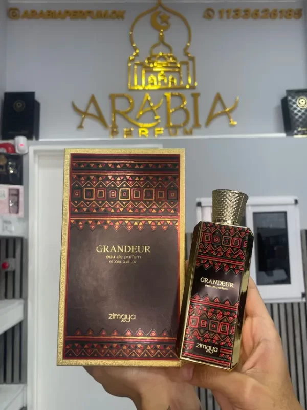 Grandeur de Zimaya es una fragancia de la familia olfativa Oriental Amaderada para Hombres y Mujeres.