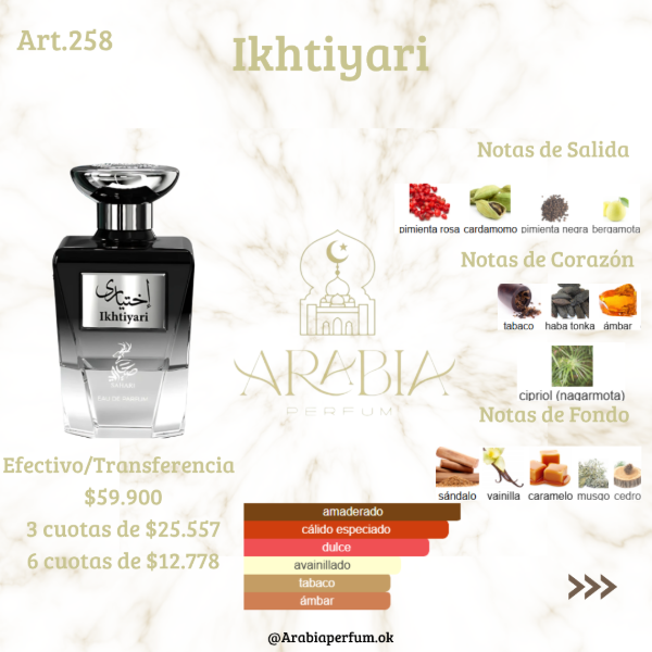 Más que una fragancia, Ikhtiyari es una declaración de tu aura cautivadora. Diseñado para quienes aprecian la sofisticación que los distingue, este exclusivo Eau de Parfum capta la atención y la admiración sin esfuerzo.