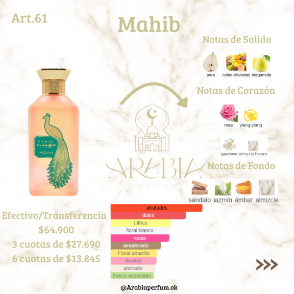Mahib de Adyan es una fragancia de la familia olfativa Floral Frutal Gourmand para Mujeres.