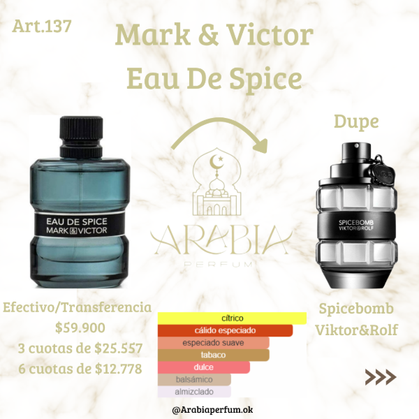 Eau de Spice de Fragrance World, también conocido como Mark & Victor Eau de Spice, es una fragancia masculina que se inspira en Spicebomb de Viktor & Rolf. Este Eau de Parfum está diseñado para aquellos que buscan un aroma audaz y robusto, perfecto para destacar y dejar una impresión duradera.