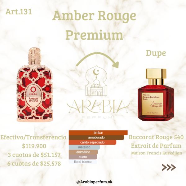 Amber Rouge de Orientica Premium es una fragancia de la familia olfativa Amaderada Especiada para Hombres y Mujeres.