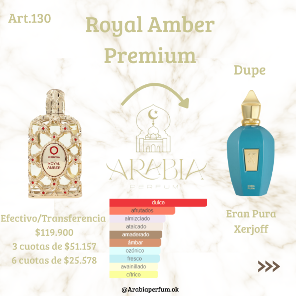 Royal Amber de Orientica Premium es una fragancia de la familia olfativa Oriental Vainilla para Hombres y Mujeres.