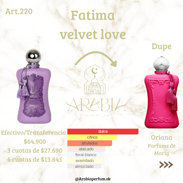 Fatima Velvet Love By Zimaya es una fragancia de la familia olfativa Oriental Floral Chipre para Mujeres.